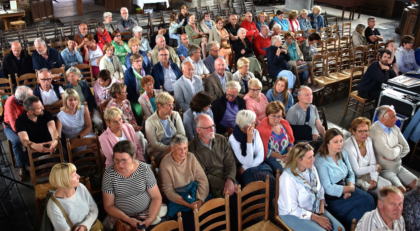 - Daarna melden we ons aan met het ticket aan de ingang van de O.L.V.-Hemelvaartkerk, waar het West-Vlaamse duo LunAcoustic om 19u30 een sfeervol luisterconcert brengt. Burgemeester Joachim Coens verwelkomt het publiek.